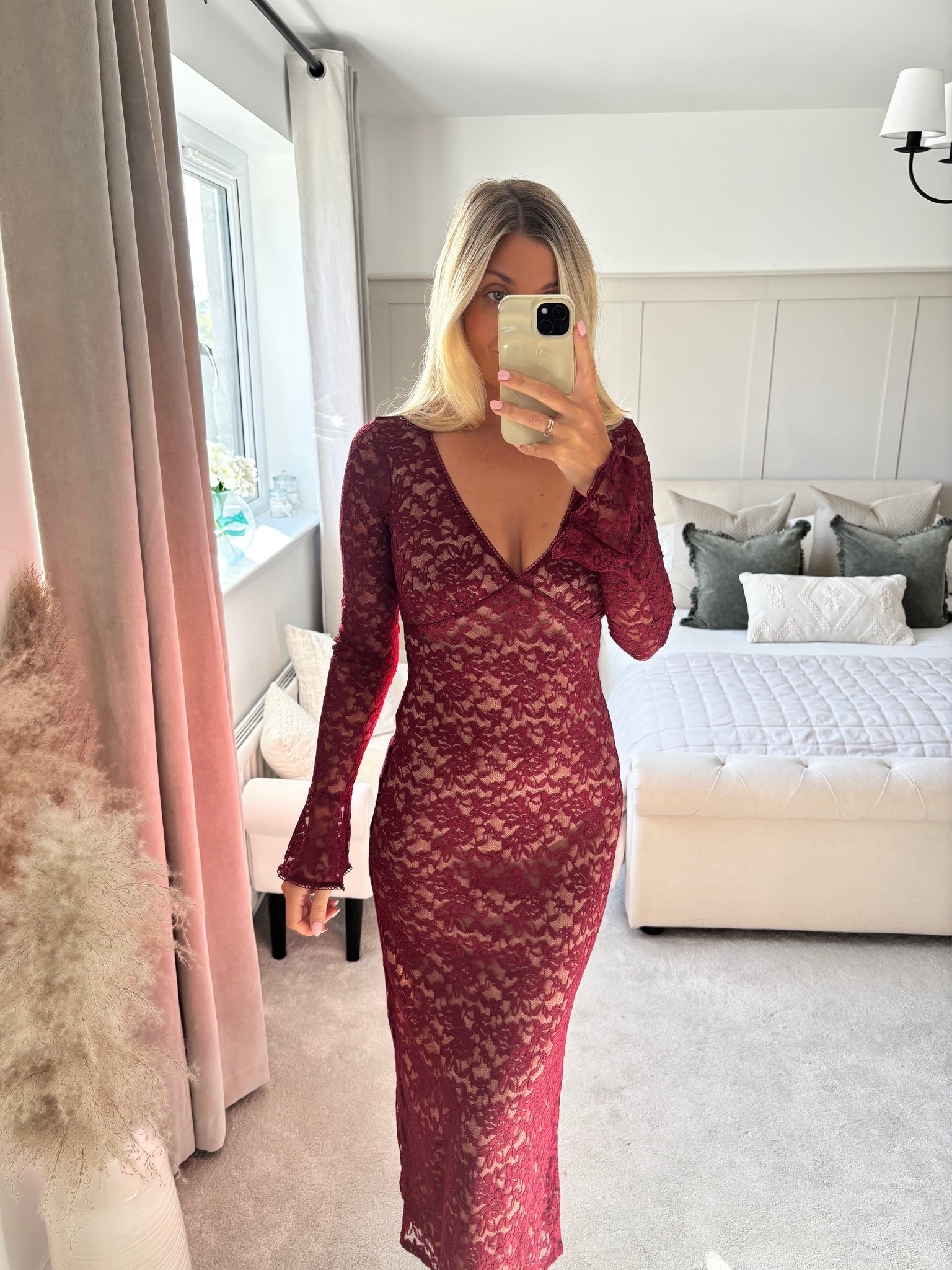 A stunning lace, fully lined dress in the colour of the moment - chocolate brown! Featuring V neck and Fluted sleeve.
