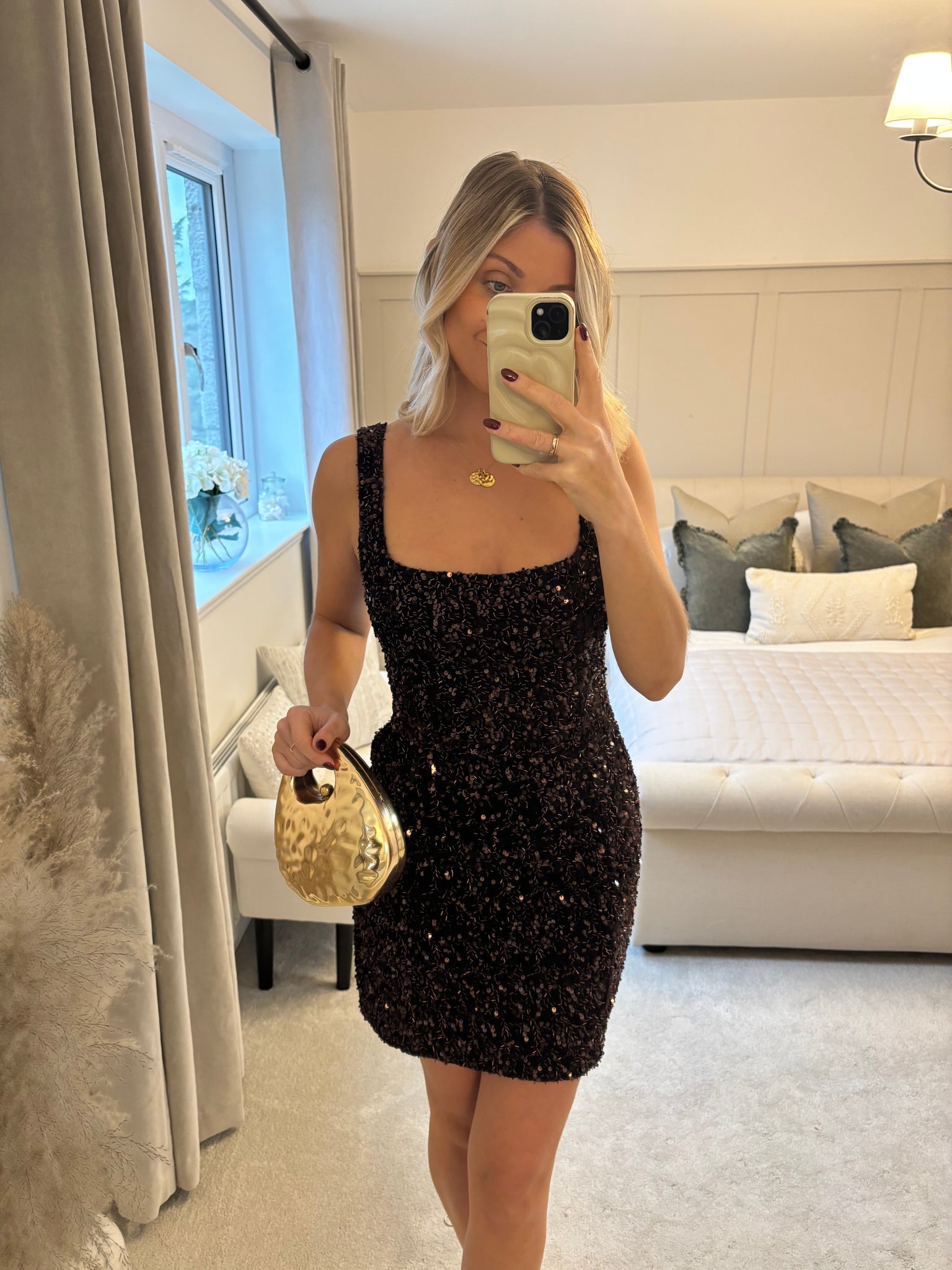 Brown sequin mini dress featuring lace fastening to the back. Stretchy material.