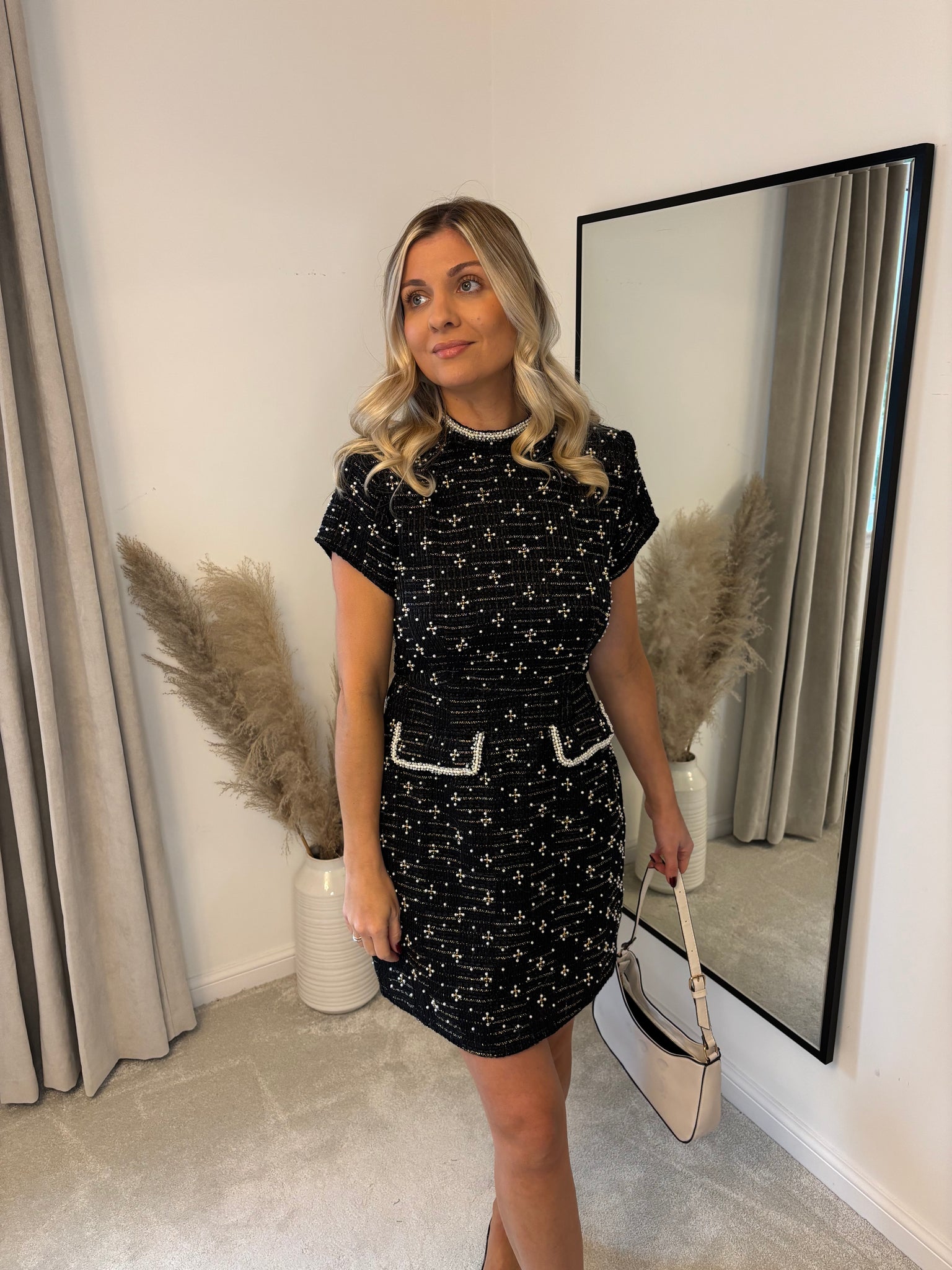 A stunning tweed embellished dress featuring pearl neckline and zip fastening at back. Two pearl imitation pockets to front. Be sure to stand out in this beauty!