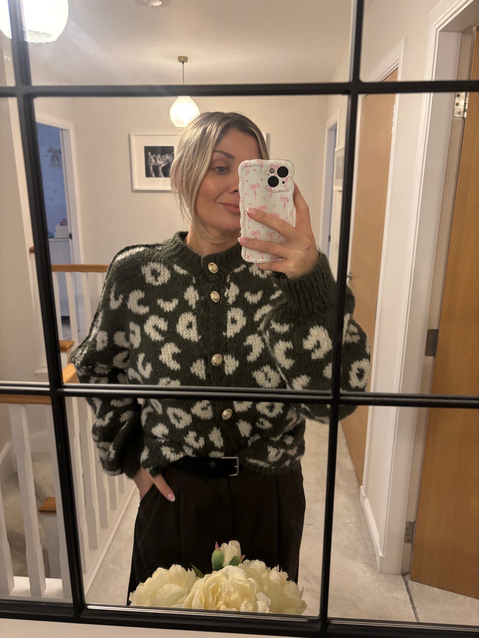 A gorgeous soft knit cardigan featuring khaki and cream leopard print design and gold button fastening. Perfect combination of colours.