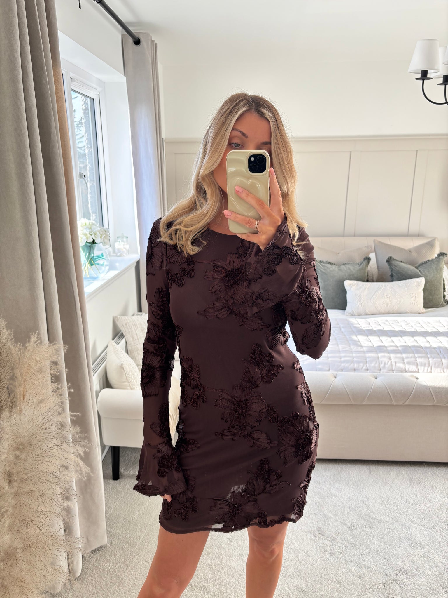 A Gorgeous chocolate brown dress featuring fluted cuffs and floral appliqué. Button fastening at back. Fully lined.