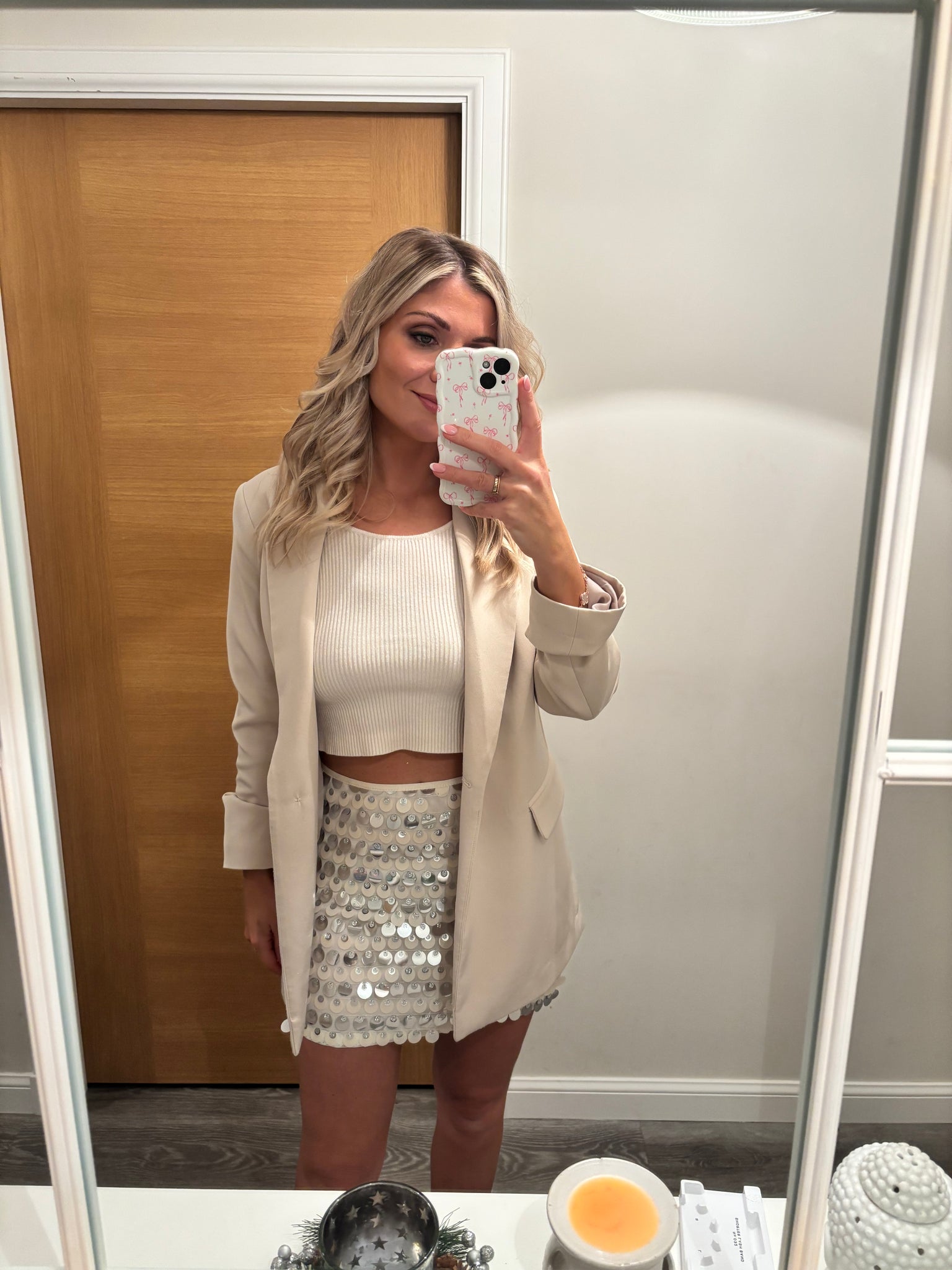 A beautiful skirt featuring zip fastening and silver sequin discs all over.