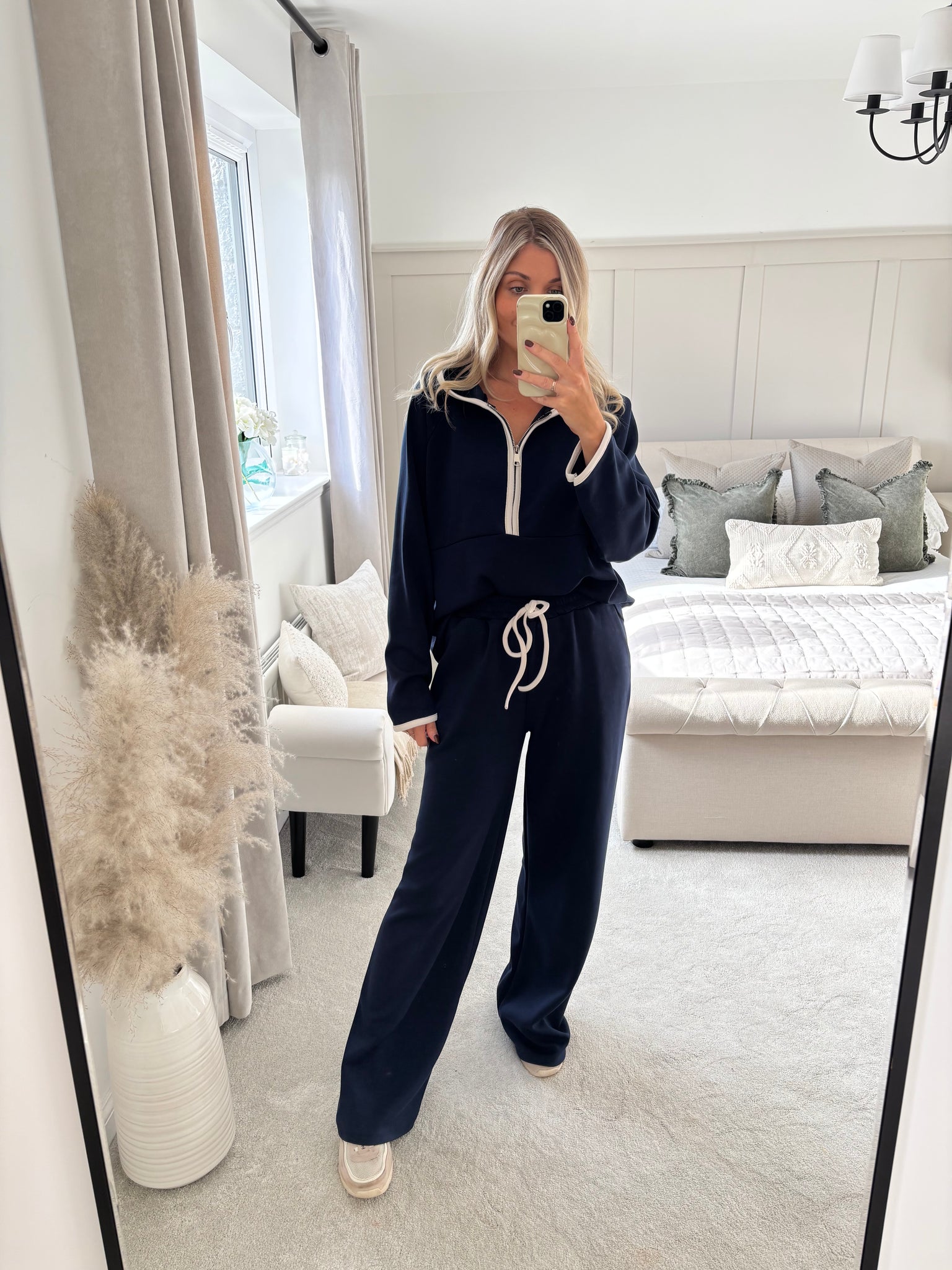 Jumper featuring hood, half zip and constant piping. Trousers featuring contrast waist tie and elasticated waist.